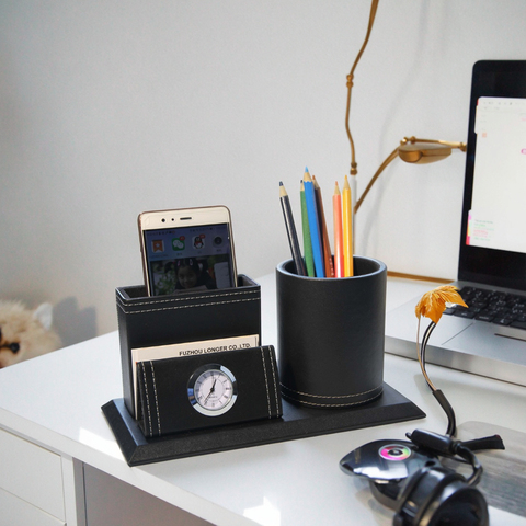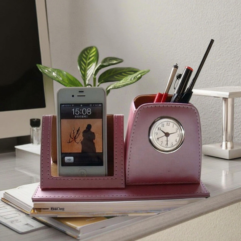 LG-B038B PU Leather Desktop Accessories with Clock Pen and Phone Holder for Office Sundries Storage Pen Holder