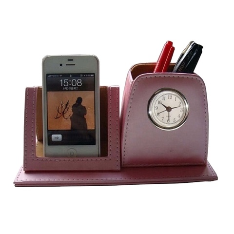 LG-B069 Pu Leather Office Desk Organizer Handmade Pen Holder W/clock Name Card Holder Business Gift Promotional Items
