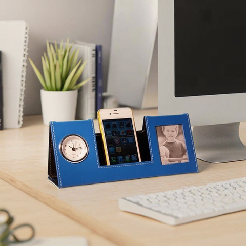 LG-S008 PU Leather Phone Stand W/ Clock and Photo Frame Corporate Gift Phone Stand Business Office Gift with Clock